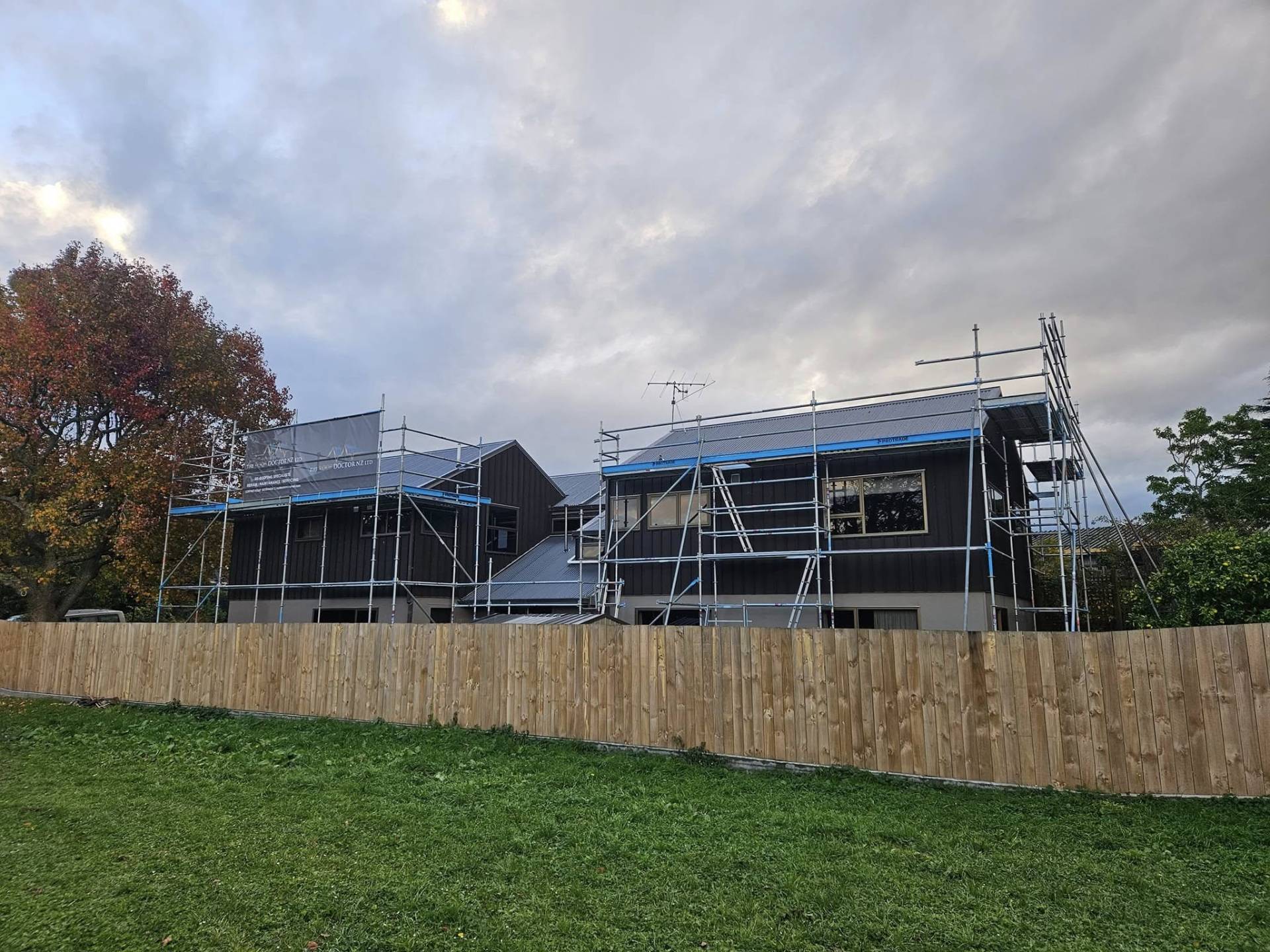 A large re-roofing project underway on a modern home in Palmerston North, Manawatū. With scaffolding
